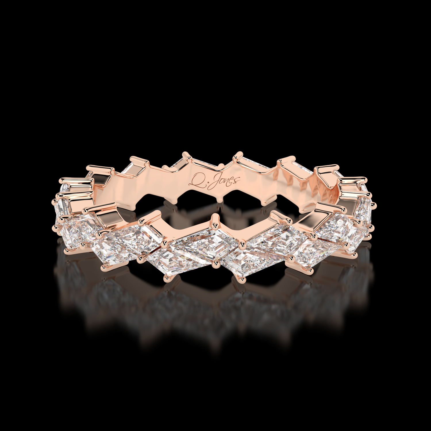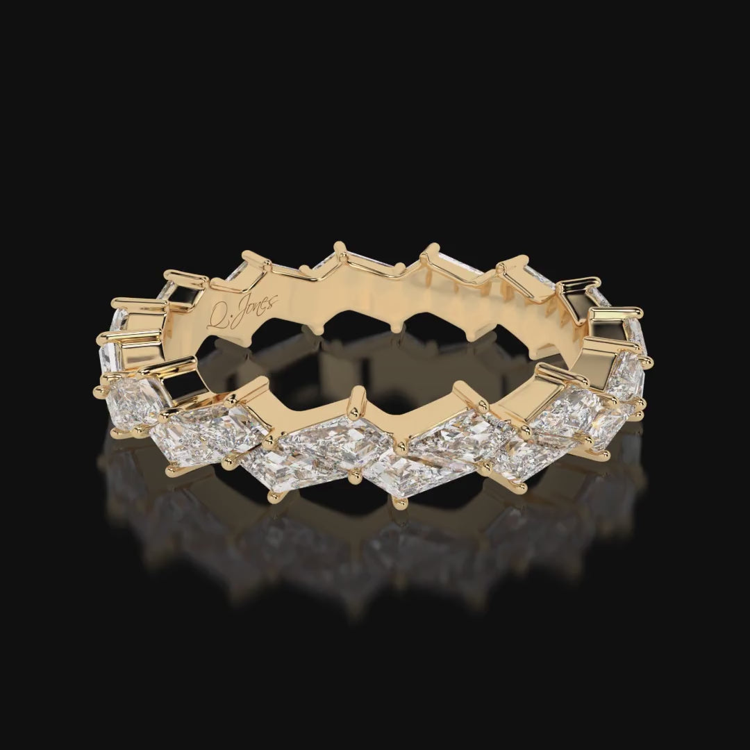 Aurelia's Radiance is a stunning and exquisite kite diamond eternity ring crafted in 14kt gold. The ring showcases an enchanting arrangement of sparkling kite-shaped diamonds, delicately set in a continuous band of luminous gold. The unique kite shape brings a touch of modern elegance to the classic eternity design, while the 14kt gold adds a luxurious timeless appeal. This ring celebrates the everlasting beauty of diamonds, symbolizing eternal love, and is destined to capture the attention and admiration of all who see it. This ring is the epitome of sophistication and grace, a dazzling statement piece that effortlessly enhances any attire or occasion.
