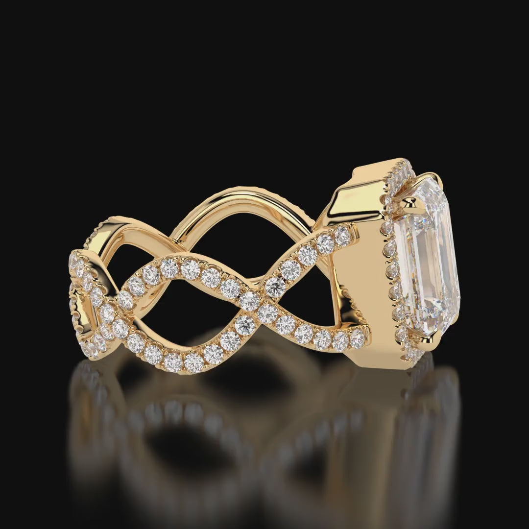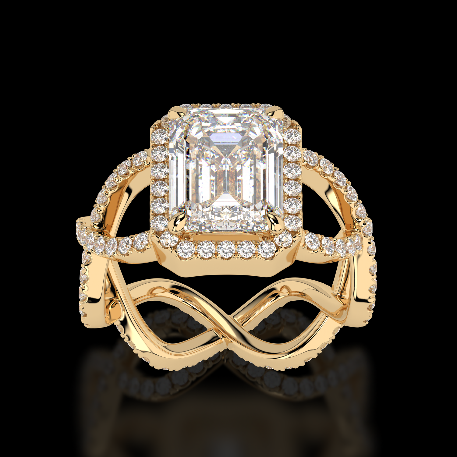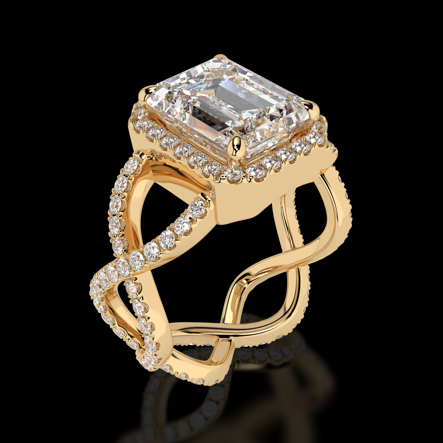 The "Aurora" 3ct Emerald Cut Twisted Shank Yellow Gold Diamond Engagement Ring is a breathtaking symbol of love and commitment. Crafted in lustrous 18k yellow gold, this exquisite ring features a mesmerizing 3-carat emerald-cut diamond as its centerpiece. The emerald cut, with its elegant elongated shape and step-cut facets, exudes timeless sophistication and allows for exceptional clarity and brilliance.