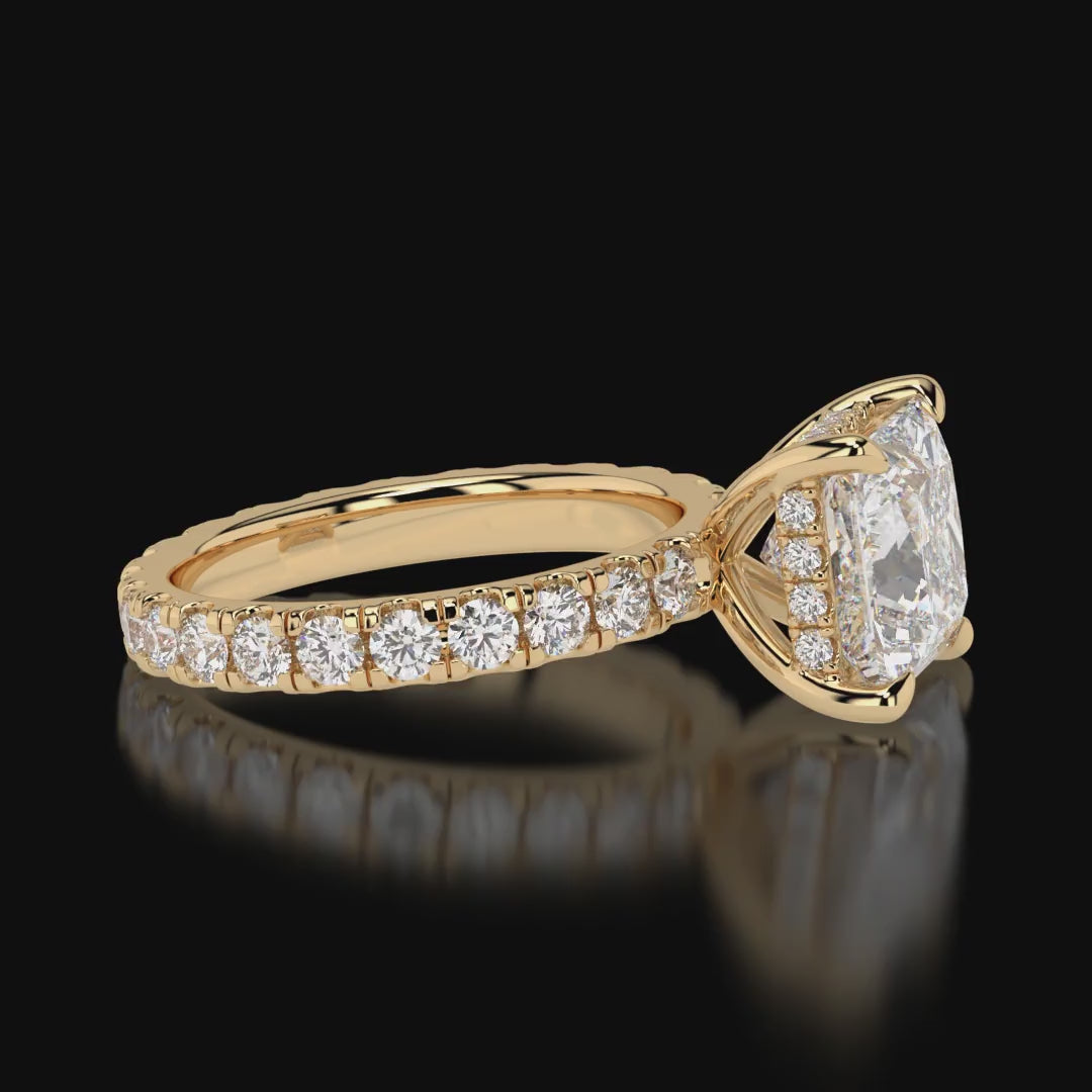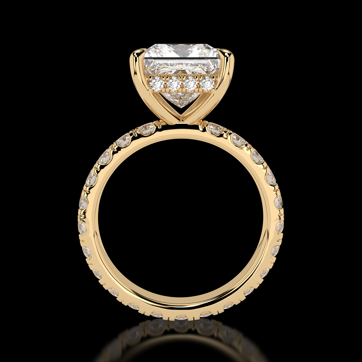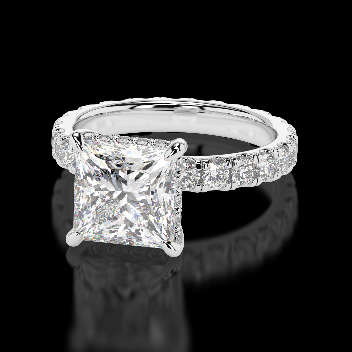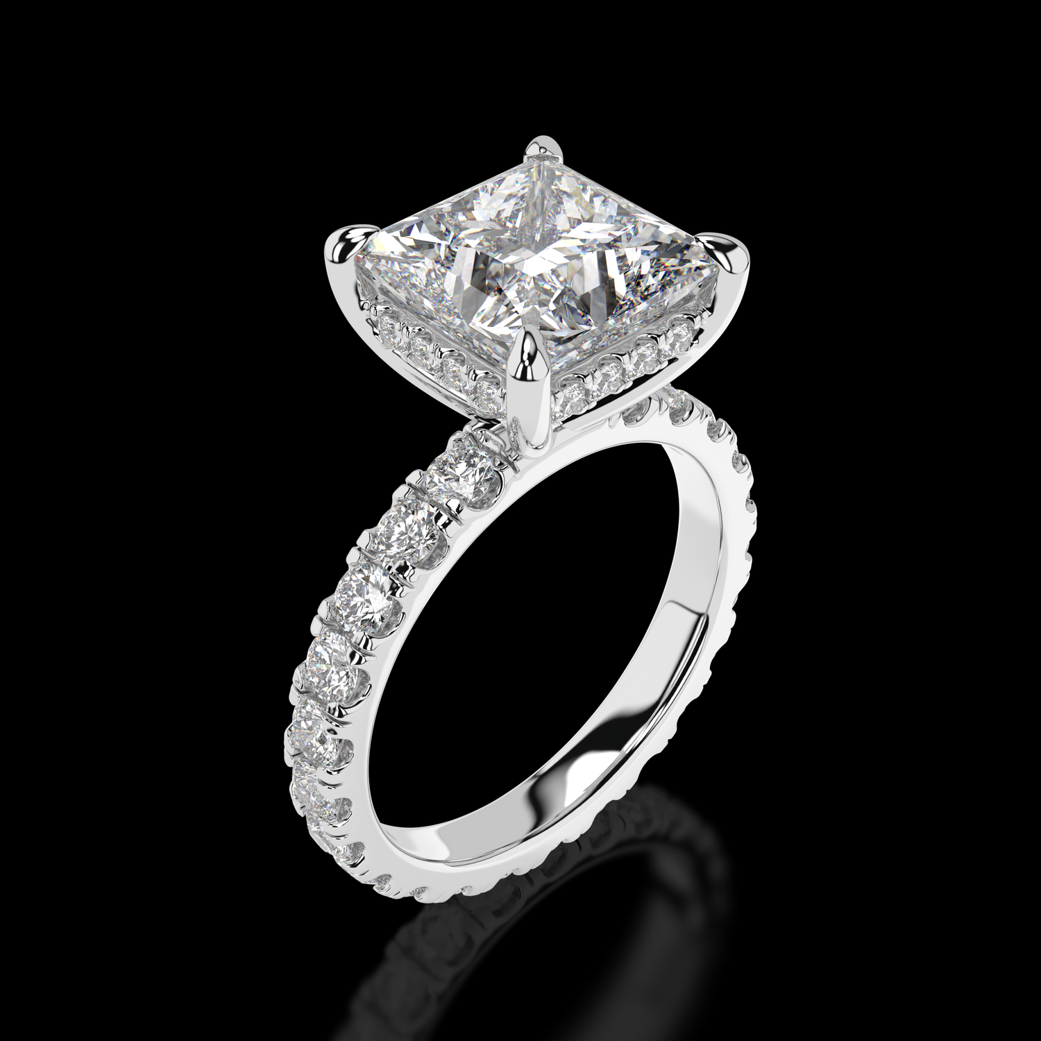 The Enchanting Elegance Ring, showcases a captivating 3ct princess cut diamond framed by a halo of smaller diamonds, adding extra sparkle and glamour to the piece. This rings is sure to capture the heart of it wearer with its timeless beauty and sophistication.