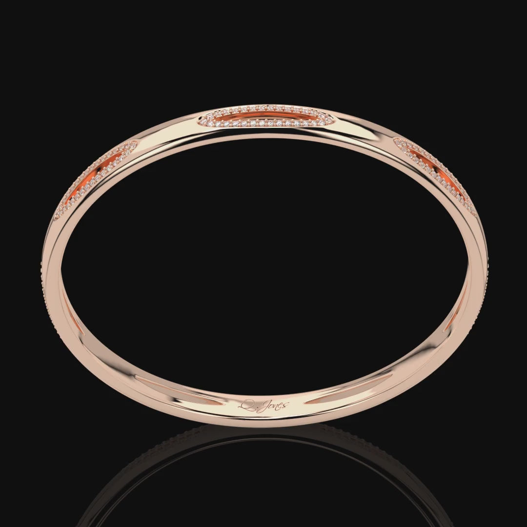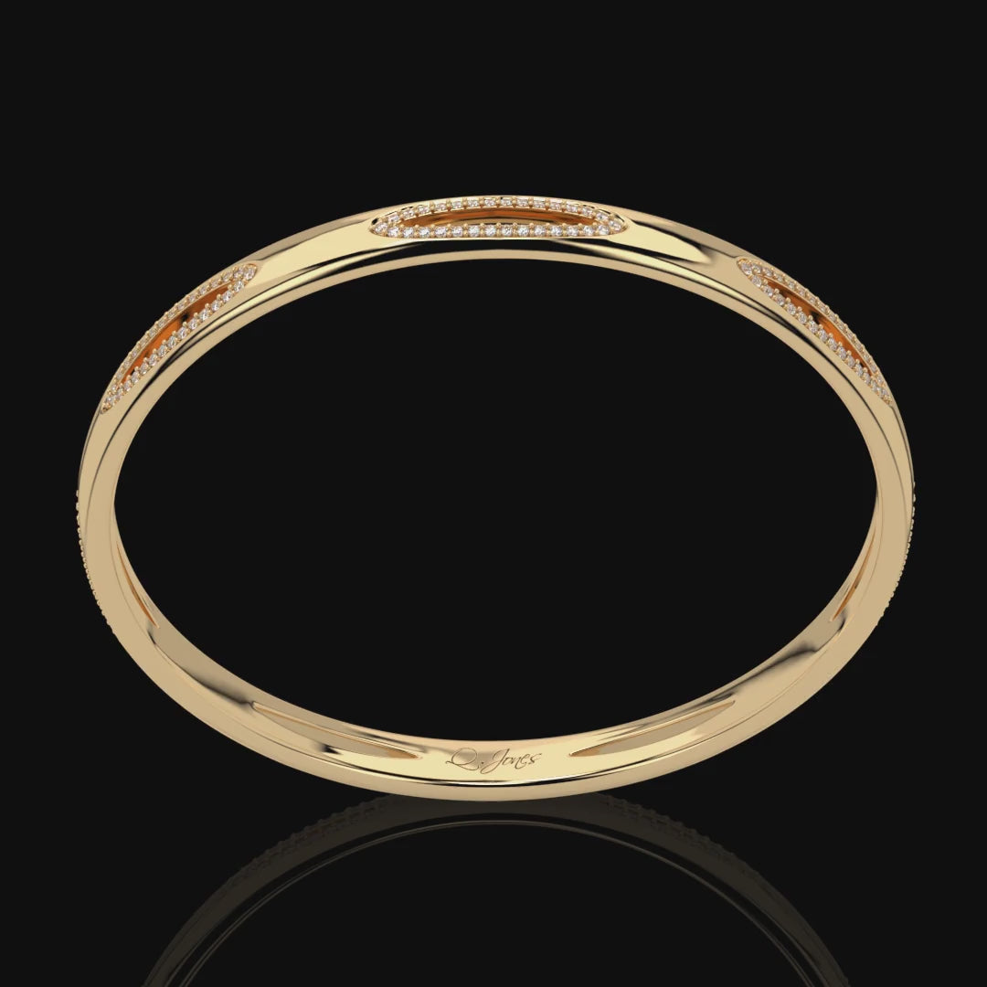 Make a statement with this exquisite 14k gold bangle featuring a captivating oval cutout design adorned with dazzling diamonds. The intricate craftsmanship of the radiant oval cutout creates a striking visual effect, drawing attention to the wrist with its elegant and modern design. Each diamond is carefully set within the bangle, adding a touch of luxury and sophistication to the piece. This bangle is a perfect blend o classic charm and contemporary style, making it a versatile accessory that can be worn for both formal occasions and everyday glamour. Elevate you look with this radiant oval bangle that embodies timeless beauty and elegance.