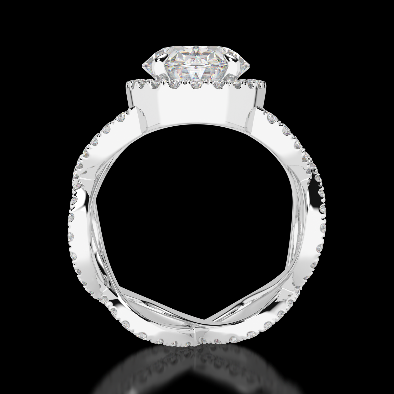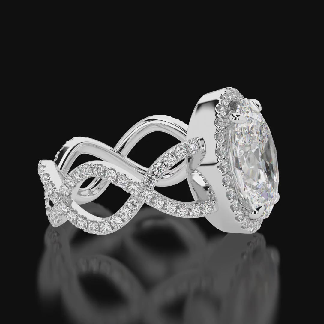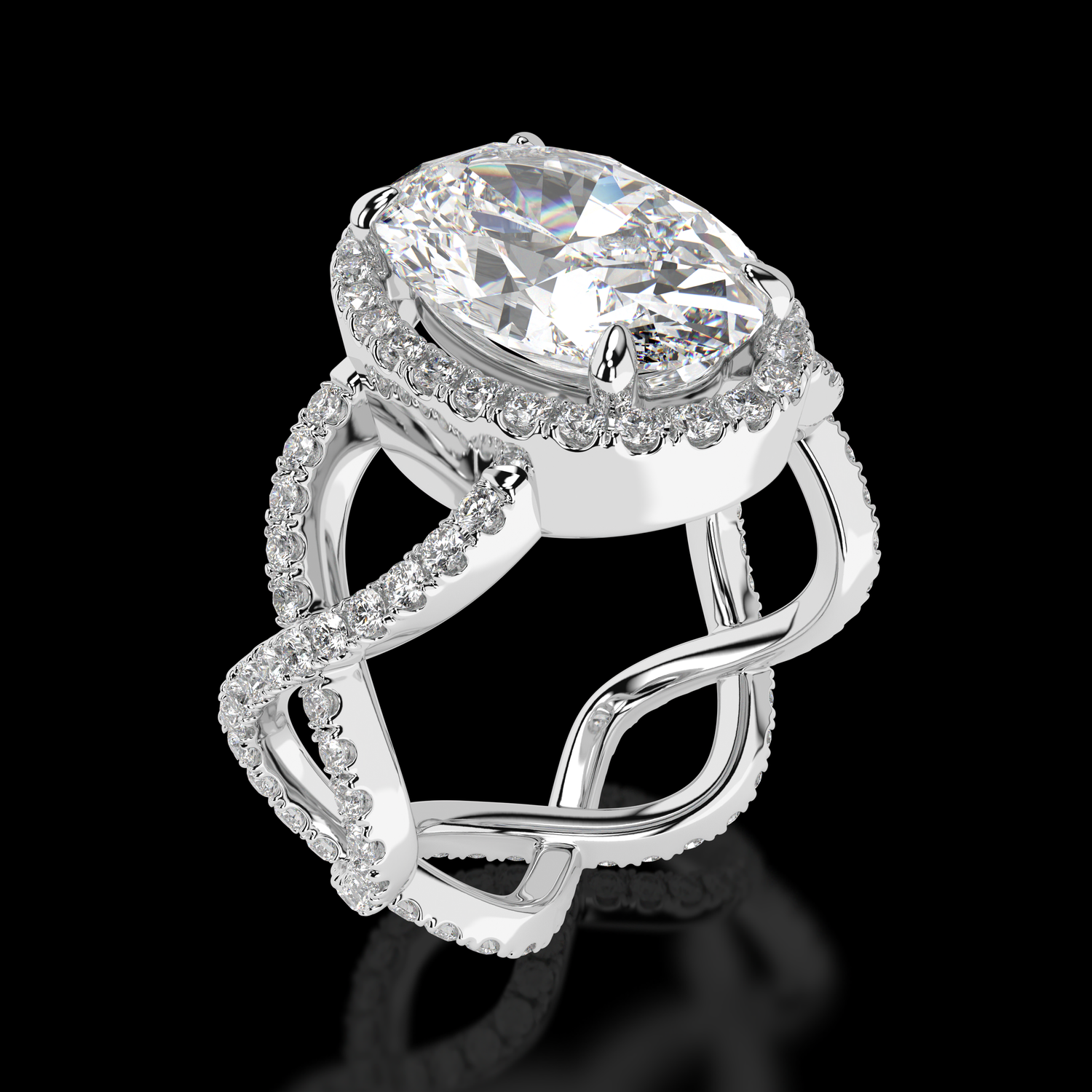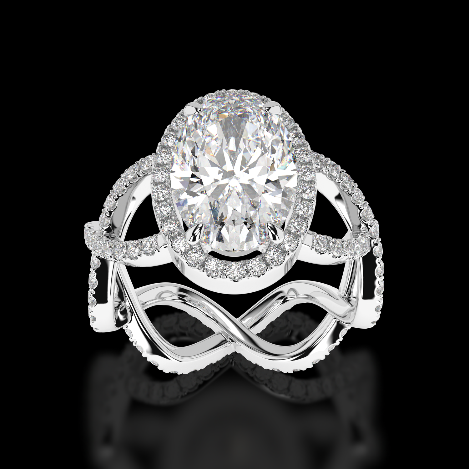 The "Serene Twist" engagement ring showcases a stunning 3-carat oval-cut diamond nestled within an exquisite twisted shank setting. The oval diamond, with its graceful lines and brilliant faceting, serves as the focal point of this captivating design, exuding timeless elegance and sophistication.