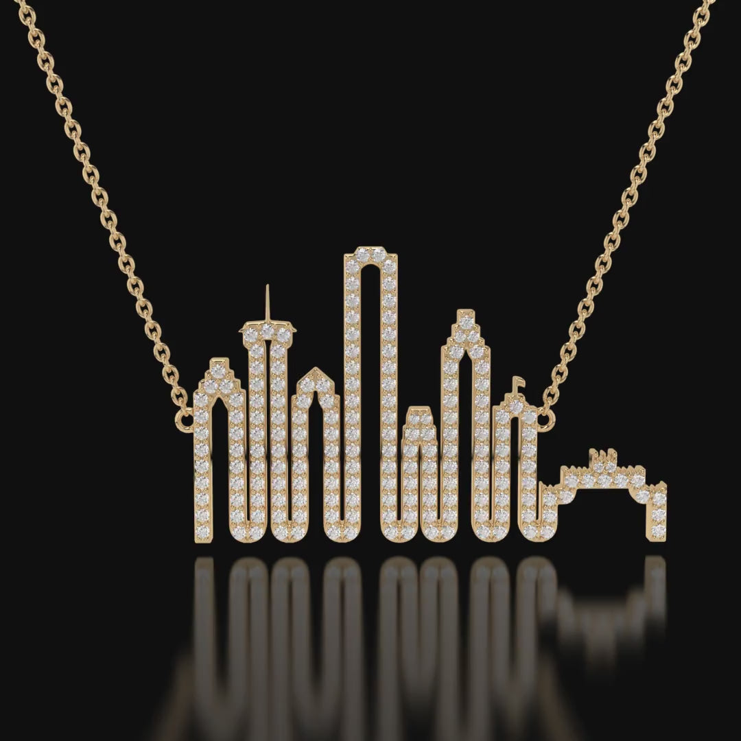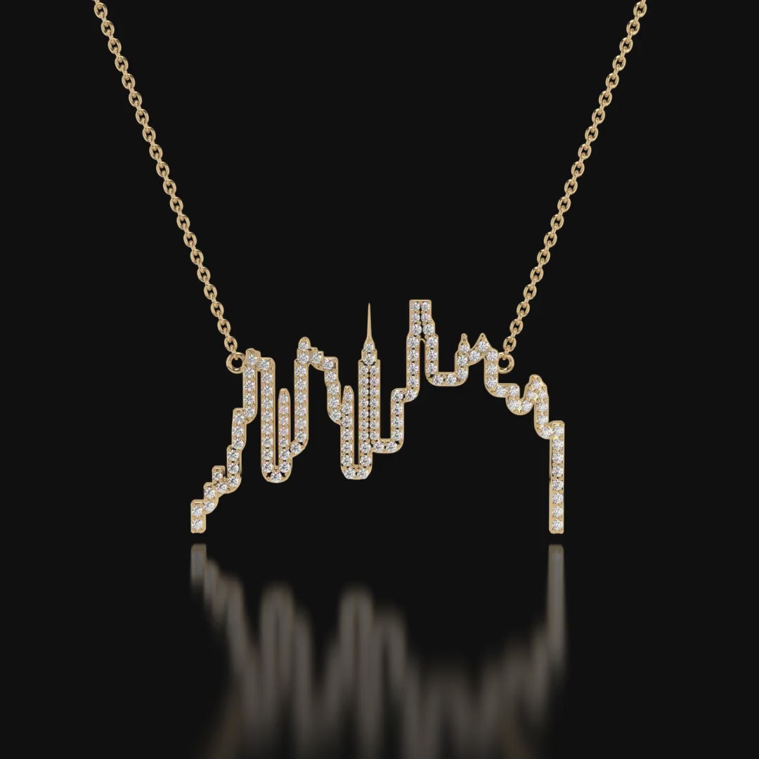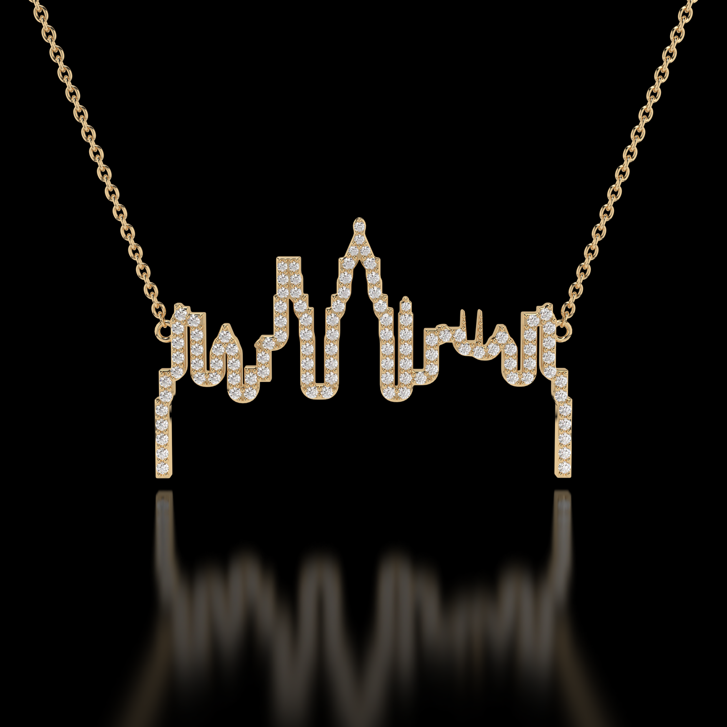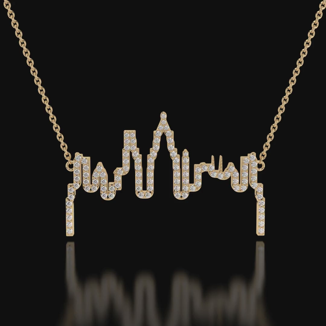 Capture the essence of a bustling cityscape with this stunning 14k gold pendant featuring a dazzling city skyline design adorned with shimmering diamonds. The intricate silhouette of the city skyline is meticulously crafted to showcase iconic landmarks and buildings, creating a piece of jewelry that celebrates the urban allure. Each diamond represents a sparkling light in the cityscape, adding a touch of brilliance and sophistication to the pendant. This Urban brilliance diamond city skyline pendant is a unique and stylish accessory that pays homage to the beauty and energy of city life. Wear its as a symbol of your love for the urban landscape or as a reminder of your favorite city wherever you go.